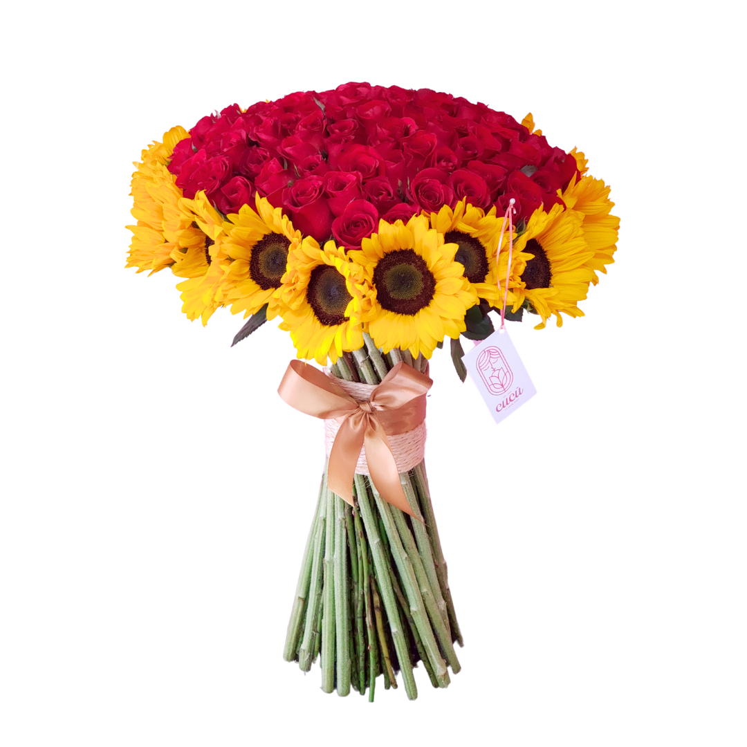 Expresa tus sentimientos con este hermoso ramo que combina la elegancia de las rosas con la calidez de los girasoles. Los girasoles rodean el centro creando un efecto visual deslumbrante, mientras que el lazo añade un toque de sofisticación. Perfecto para sorprender a alguien especial en cualquier ocasión, desde aniversarios hasta celebraciones inesperadas. Un regalo que habla por sí solo.
