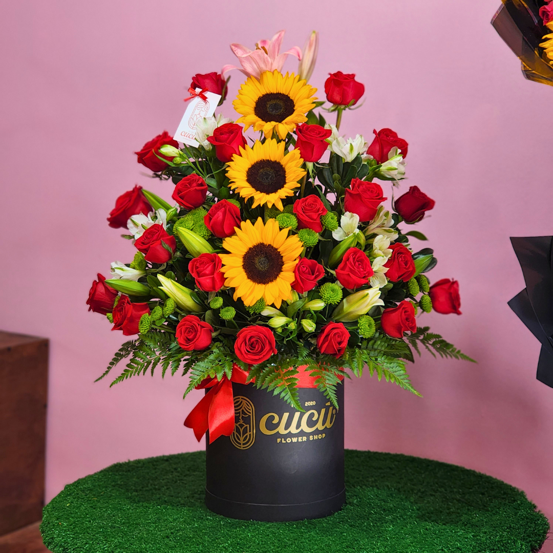 Nuestro Arreglo Equinoccio es una explosión de color y alegría que combina la elegancia de las rosas con la calidez radiante de los girasoles. Cada flor ha sido cuidadosamente seleccionada para crear un equilibrio perfecto entre la sofisticación y la diversión. Ideal para sorprender a alguien especial, celebrar un momento importante o simplemente iluminar cualquier espacio con su presencia vibrante. Un regalo que dice "te quiero" de la forma más colorida y memorable.