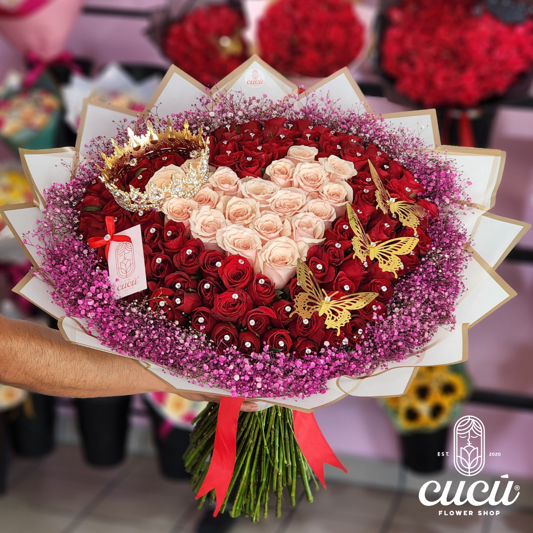 Expresa tu amor de la forma más romántica con este espectacular ramo de 100 rosas que forma un corazón en el centro. Rodeado de delicadas flores de nube que añaden textura y elegancia, complementado con pines decorativos y una majestuosa corona que lo hace verdaderamente especial. Perfecto para sorprender a esa persona que hace tu corazón latir. ¡Un regalo que definitivamente robará suspiros!