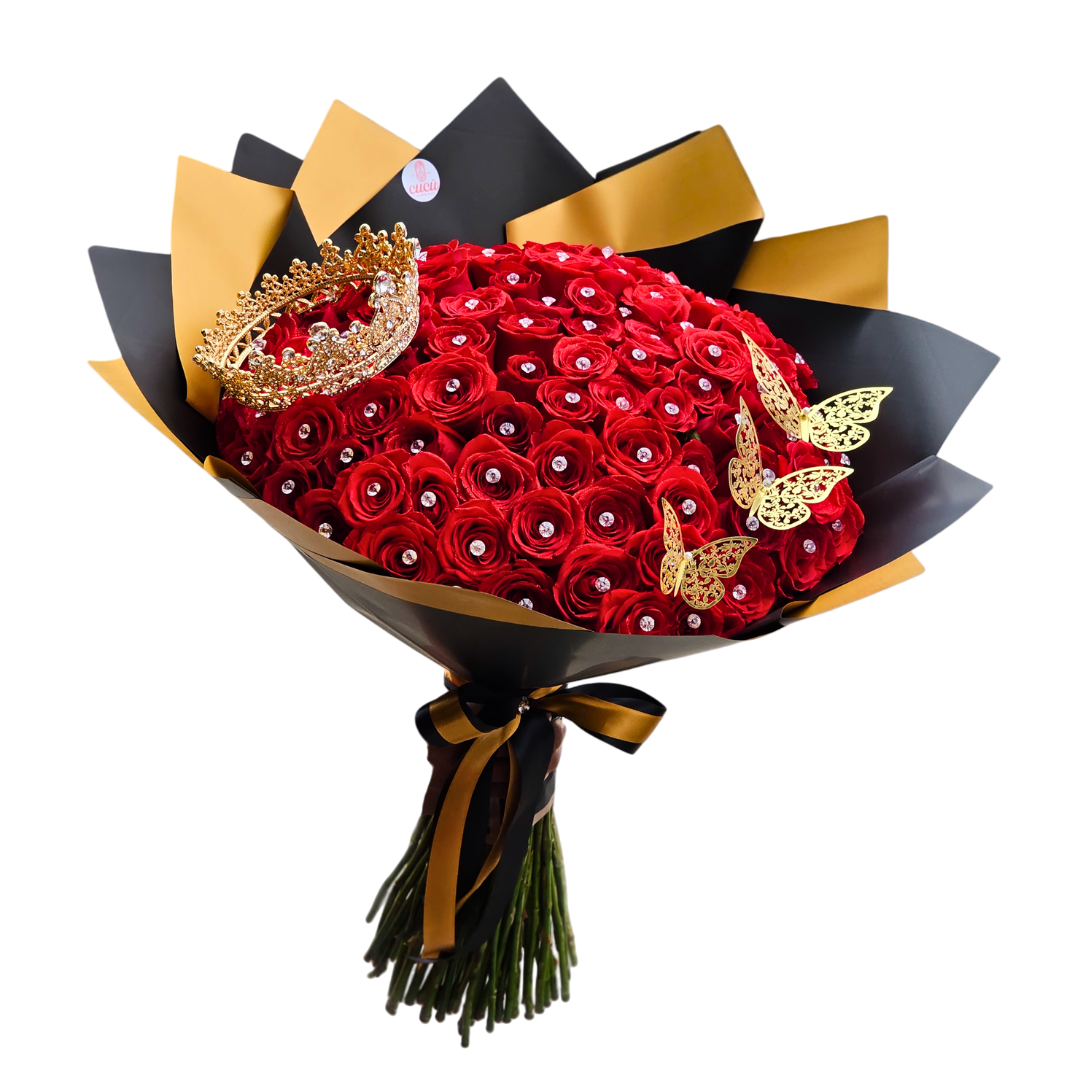 Cien rosas rojas en un solo ramo: la declaración de amor más espectacular que puedas imaginar. Cada rosa está acompañada de delicados pines de fantasia, una corona majestuosa que corona el arreglo y tres mariposas que danzan alrededor del ramo. Perfecto para sorprender a esa persona especial con un gesto que grita "¡te amo!" desde todos los ángulos. Un ramo que no solo habla de pasión, sino que también presume de estilo y creatividad. Porque a veces, lo bueno viene en números grandes.