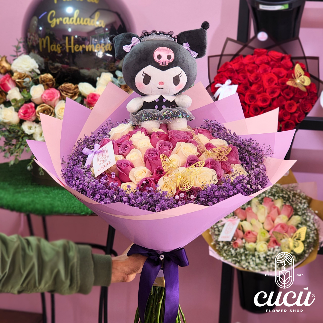 Expresa tu amor de forma adorable con nuestro Ramo Kuromy, un arreglo floral que combina 50 rosas lilás y blancas en perfecta armonía. Rodeadas por delicadas flores de nube morada, estas flores crean un efecto visual cautivador. En el corazón del ramo descansa un tierno peluche de Kuromy, el personaje más adorable de Sanrio, que añade un toque de ternura y diversión. Ideal para sorprender a alguien especial en cualquier ocasión, este ramo es la mezcla perfecta entre naturaleza y peluche de ensueño. ¡Un regalo que combina belleza floral con la dulzura de Kuromy!